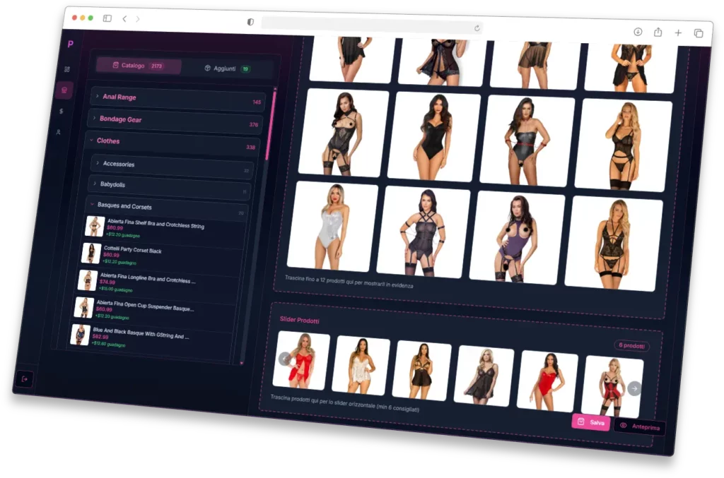 Non serve essere esperti di tecnologia per avere successo. Pinkinlove è progettata per essere intuitiva e immediata. Registrati, seleziona i prodotti che rispecchiano il tuo stile e condividi il link. Nessun magazzino da gestire, nessuna spedizione da organizzare. Concentrati solo sulla creazione dei tuoi contenuti, al resto pensiamo noi.